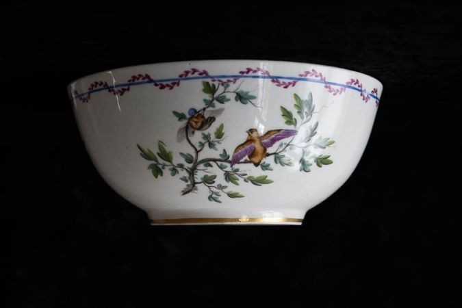 Schale; auf weißem Muster mit Zweigen und Vögeln, am Boden: M.O.L. (in blau) eingebacken (eingeritzt): D / M.O.L. Die Porzellanfabrik M.O.L. / Oude Loosdrecht wurde gegründet durch Johannes de Mol (Midlum 1726-1782 Amsterdam) im Jahr 1774