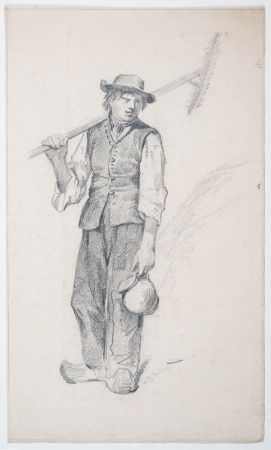 Stehender Bauer mit Rechen auf der rechten Schulter, Trinkkrug in der linken Hand, in Holzschuhen.