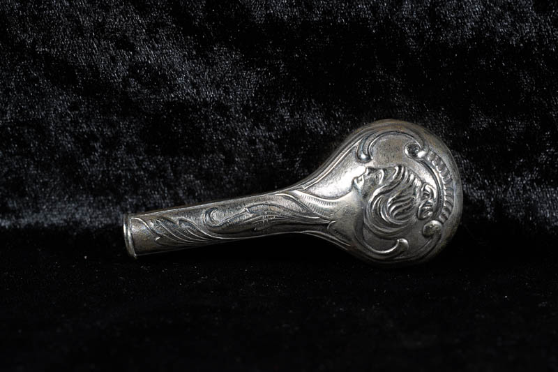 Kleine Stange, mit rundem Knopf; Reliefdekor: Stange mit Ranken, Vorderseite Knopf Jugendstil Frauenkopf, hinten Blumen.