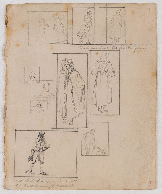 Skizzen von diversen Personen, aus verschiedenen Blickwinkeln gesehen. Bezeichnet: Laat ons toch ter Kerke gaan / Met het schrijven is niets te verdienen