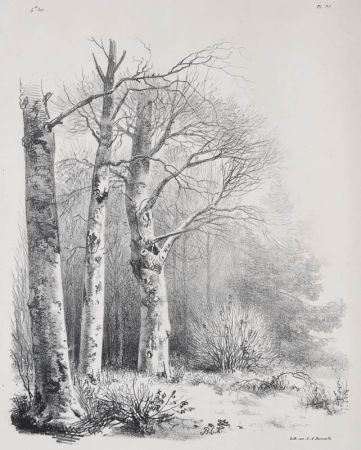 Landschaftsstudien / landschapstudies, Waldstück mit drei Birkenstämmen; 22. Blatt von 59 Lithographien.