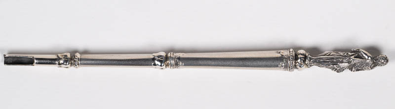 Federhalter für Stahlfeder; runder Schaft, nach unten schmal zulaufend; oben, unten und in der Mitte Lambrequin-Ornamente; als Knopf eine stehende, klassische Frauenfigur, das Kinn auf den rechten Arm lehnend, einen Krug in der linken Hand.