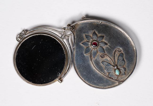 Behälter in Blatt- oder Tropfenform, mit drehbarem Rundspiegel; Vorderseite Schmetterling und Blüte in Relief mit farbigen Steinen eingelegt; hintere Seite des Behälters und des Spiegels sind ornamental graviert; im Seitenrand eine kleine abschließbare Öffnung (unbekannt wofür); mit Aufhängeöse.