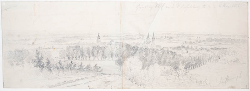 Blick vom Klever Berg über die Stadt, mit der Schwanenburg und Stiftskirche, auf die Rheinaue,1866.
