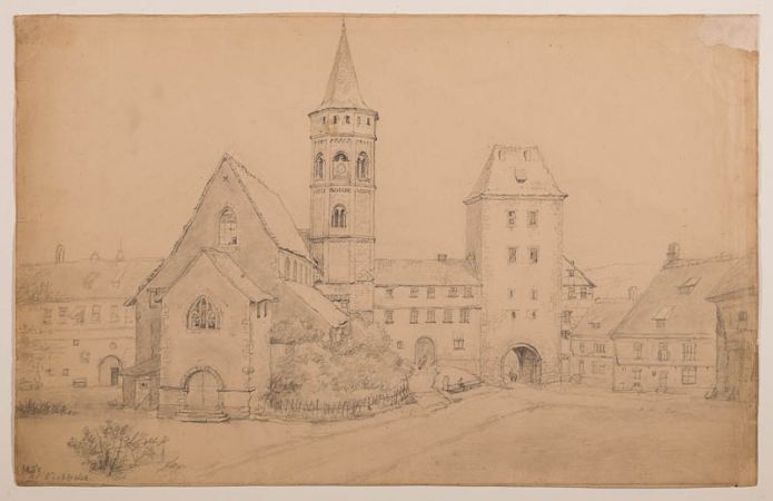 Stadtansicht auf die Kirche und das Stadttor von Eichstätt.