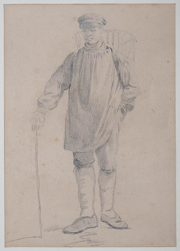 Stehender Hausierer, sogenannter Kiepenkerl; Spazierstock in der rechten Hand; Korb auf dem Rücken.