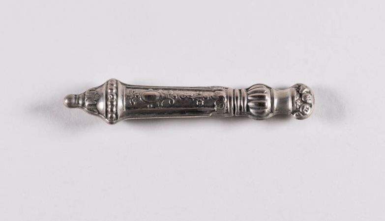 Garniturteil; Nadelbüchse in Form eines reliefdekorierten Griffes (in Anschluss an den anderen Teil der Garnitur).