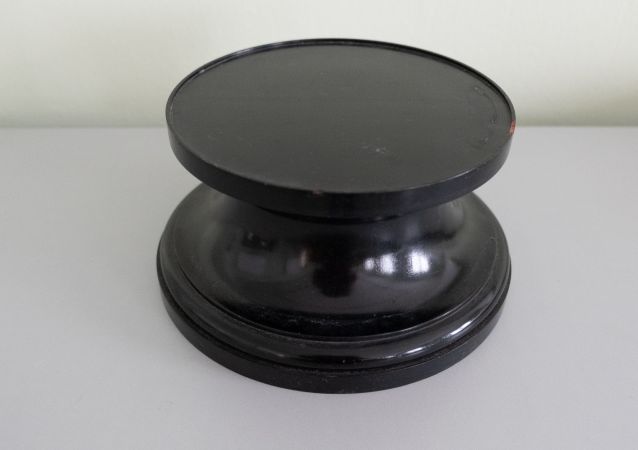Gedrechselter Skulpturensockel, obere und untere Platte, Mittelstück verjüngt sich nach oben: konkave Wölbung.