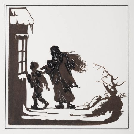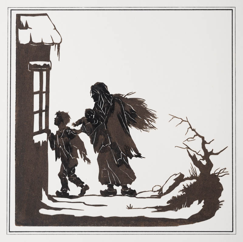 Scherenschnitt mit Märchenmotiv: ein Junge und eine Holzleserin mit kleinem Kind, in Lumpen gekleidet, stehen vor einem Haus.