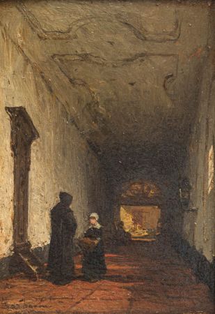 Südlicher Kreuzgang im Minoritenkloster zu Kleve; Gang im Minoritenkloster zu Kleve; südlicher Kreuzgang, die heutige Anbetungskapelle, gesehen von der Sakristei mit Blick auf die Klosterpforte.
