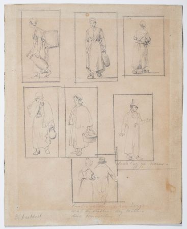 Sieben Figurstudien, vom Künstler eingerahmt auf einem Blatt:1) Mädchen mit Korb auf dem Rücken, zwei Krüge tragend, nach links2) Mädchen mit Krug3) Mädchen auf den Rücken gesehen4) Mädchen mit kleinem Krug5) Mädchen mit Korb, nach links6) Stehender Mann, gestikulierend nach rechts7) Ehepaar auf den Rücken gesehen, laufend.