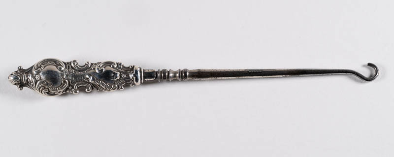 Knopfhaken; eisernes Häkchen mit Rokoko Silbergriff
