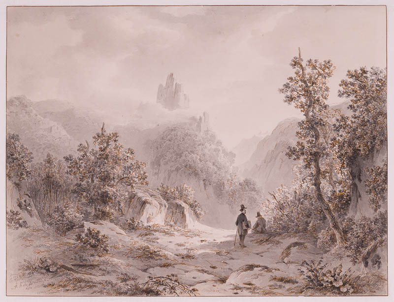 Zwei Zeichner im Gebirge; Der eine hat sein Skizzenbuch schon aufgeschlagen und sitzt zeichnend am Rande eines tiefen Tales; der andere kommt ruhig um sich blickend heranspaziert; die Bergspitze an der anderen Seite der Schlucht wird von Nebel umhüllt.