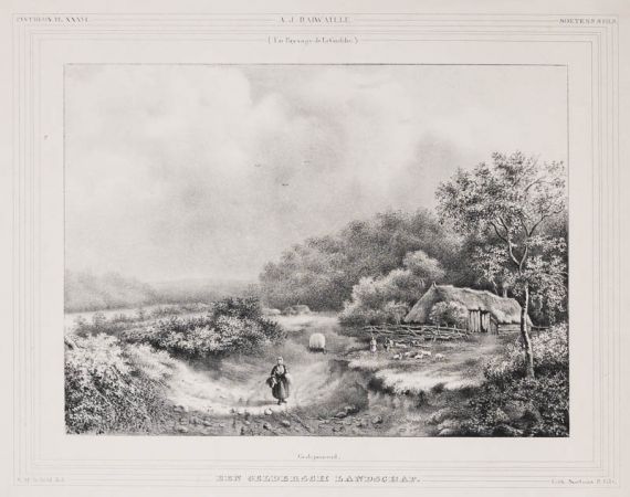 Abbildung eines Landschaftsgemäldes von A.J. Daiwaille; im Vordergrund eine Bäuerin auf einem Hohlweg; rechts Bäume, davor eine alte Scheune und eine Hirtin mit Schäfchen.