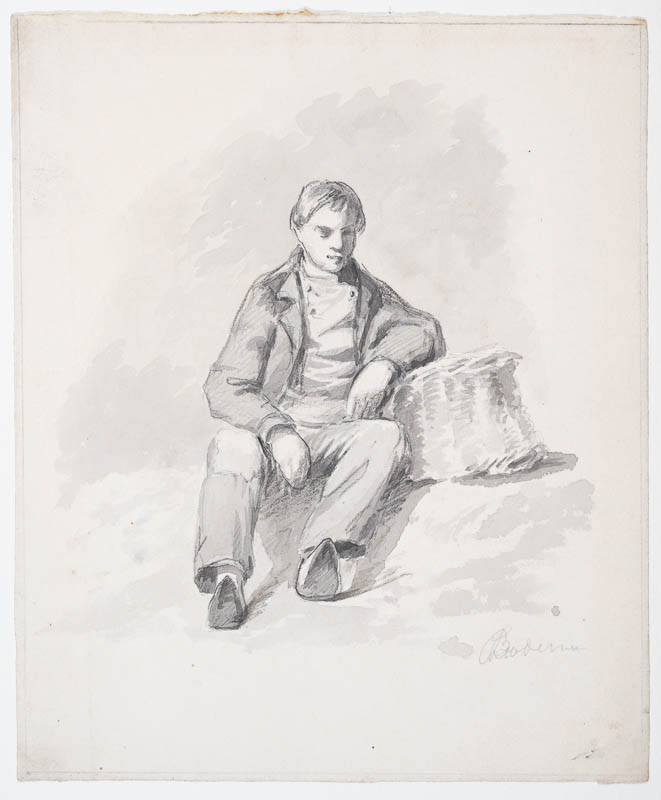Sitzender junger Mann, linker Arm gestützt auf einem Korb, in Holzschuhen.