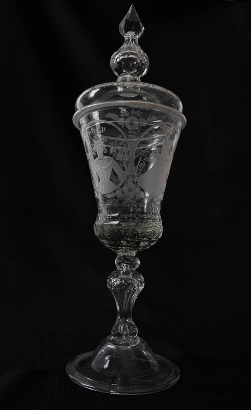 Hoher Deckelpokal; Stamm und unterer Teil des Bechers facettiert geschliffen; auf dem Becher vier geschliffene Medaillons mit Frauenfiguren der vier Jahreszeiten, beschriftet: FRÜHLING SVMMER HERSP WINDTER; Deckel mit facettierten Knopf, eingravierten Ranken.