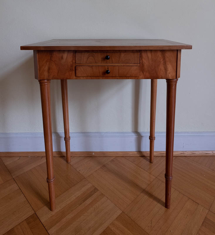 Beistelltisch (Waschtischlein) mit zwei Schüben in Kirschbaum massiv bzw. furniert auf Weichholz auf gedrechselten Beinen; deutsch.