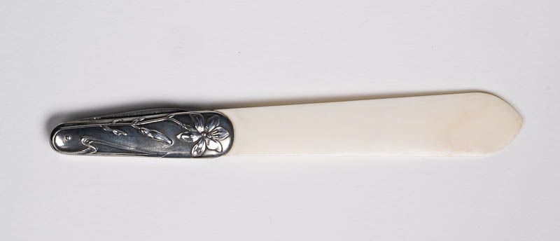 Falzbein aus Bein mit silbernem Handgriff und kleinem Messer; vorne und hinten auf dem Griff im Relief Jugendstilblumen.