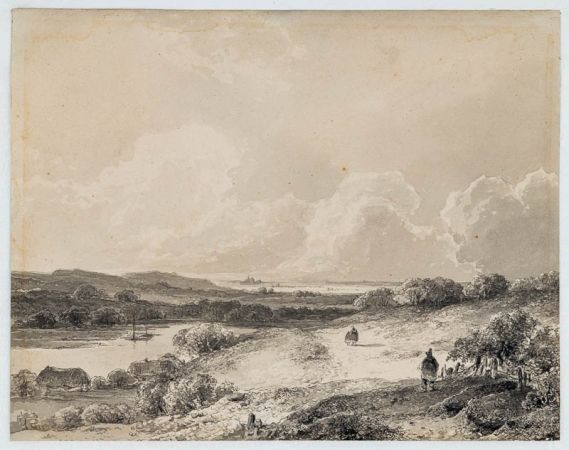 Flusslandschaft; Blick vom Hang ins weite Flusstal; im Vordergrund rechts auf dem Weg eine Person; in der Tiefe rechts die Ebene.