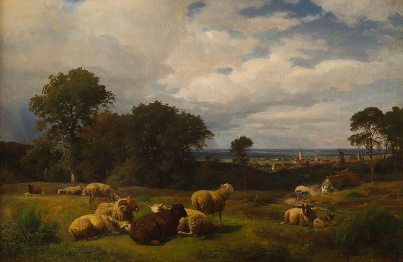 Blick auf Kleve von Montebello; im Vordergrund Schafsherde mit Schäfer, im Hintergrund Blick auf die Stadt mit dem 1843 von Koekkoek errichteten Belvedere; auf dem Weg in die Stadt Hofgebäude und Heuwagen.