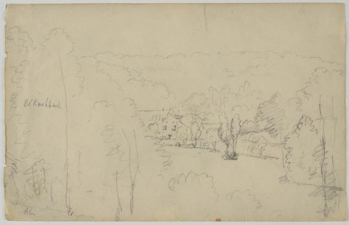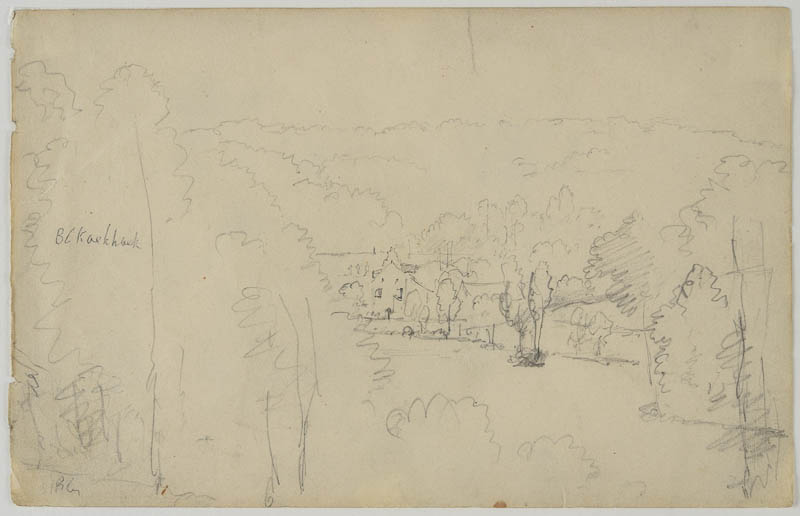 Skizzenbuchblatt: von Wäldern umgebenes Dorf in einem Tal; G. Lemmens vermutet, dass die Häuser mit dunklerem Bleistift überarbeitet wurden.