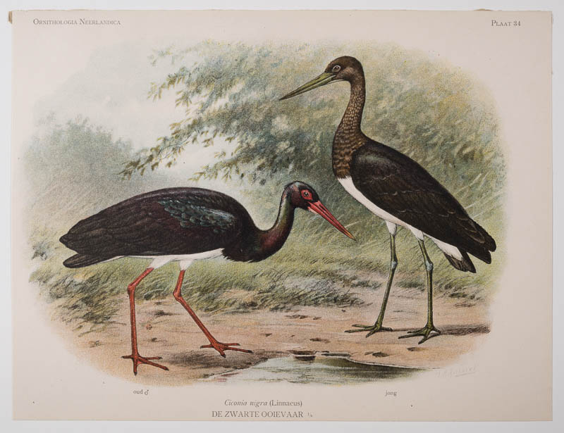 Der Schwarzstorch, Ciconia nigra (Linnaeus); Abbildung aus "Ornithologia Neerlandica"; Plaat 34. Herausgeber Daniël van Oort (1876-1933)
