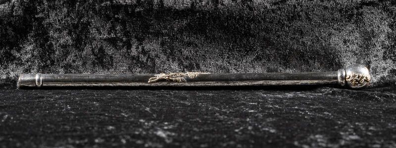 Langer, zylindrischer Griff, mit oben und unten halbrundem Band; rundes Knöpfchen, in der Mitte und auf dem Knopf vergoldeter Blumenzweig.