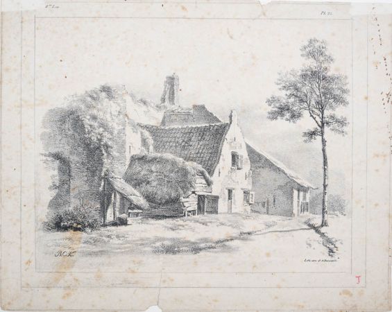 Landschaftsstudien: Bauernhäuser an einer Dorfstraße; aus "Landschap Studien" Ausgabe Koekkoek / Daiwaille 5. Lev. Pl. 25 (Inv.nr. 0874); nach B.C. Koekkoek und von ihm selbst mit Bleistift umrahmt.