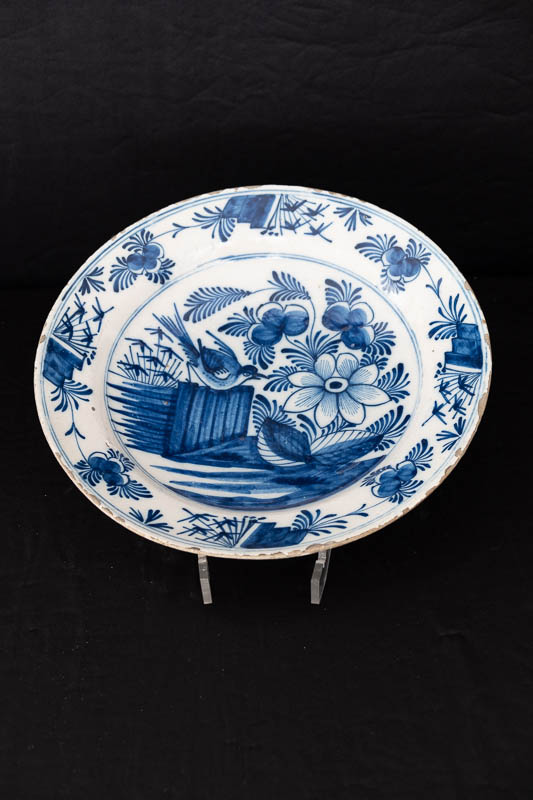 2 tiefe Wandteller, blau bemalt mit Vögeln auf einem Bretterzaun bei einer Pflanze mit einer großen Blume.