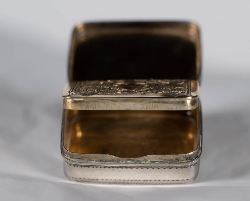 Kleine rechteckige Riechdose mit abgerundeten Ecken; Deckel graviert: halbrunde Blätter und Feld mit Monogramm HM; Innenseite vergoldet; Innendeckel mit durchbrochener Darstellung von Weinranken und Vase.