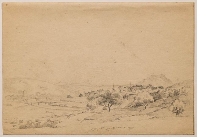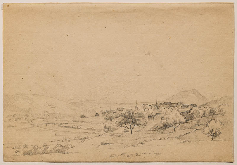Von einer Erhöhung aus Blick in die Hügellandschaft, mit einem Dorf rechts im Hintergrund und einem höheren Berg dahinter; auf der linken Seite fließt ein Fluss durch die hügelige Landschaft.