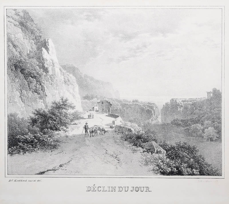 Déclin du jour; Bergpass, rauhes Gebirge, tiefe Schlucht, Viehtreiber, 2 Häuser; nach B.C. Koekkoek.