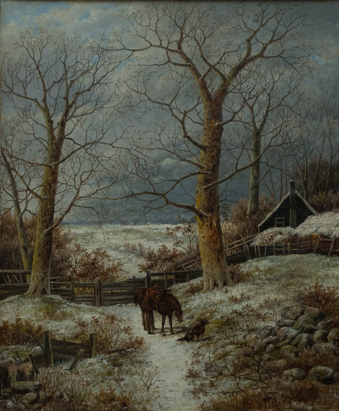 Winterlandschaft; im Bildmitte ein Mann mit einem Pferd und ein Hund.