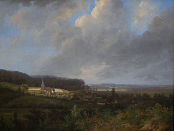 Ansicht des Dorfes Beek bei Nimwegen; Panoramablick über das sonnenbeschienene Beek von einer Anhöhe aus in Richtung Nimwegen; im Hintergrund die Ebene, weiter Wolkenhimmel.