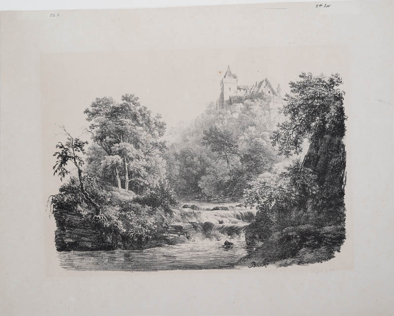 Wasserfall und Burg Landsberg a. d. Ruhr; aus: Landschapsstudien 2. Lev. Pl.8, Daiwaille nach Koekkoek um 1830, Ausgabe 2 von 1845.