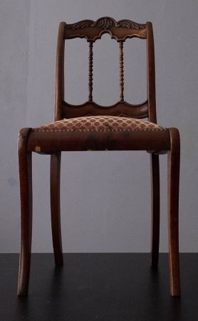 2 Stühle; Lehne mit gedrechselten Säulchen, geschwungener Abschluss; Bespannung nicht original.