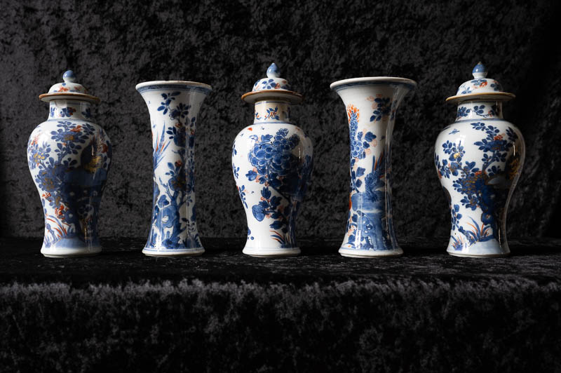 Schrankgarnitur von 5 Vasen aus chinesischem Porzellan, blau, rot und gold dekoriert, bestehend aus 3 Deckelvasen (1 Deckel nicht ganz identisch) und 2 schlanken trichterförmigen Vasen.