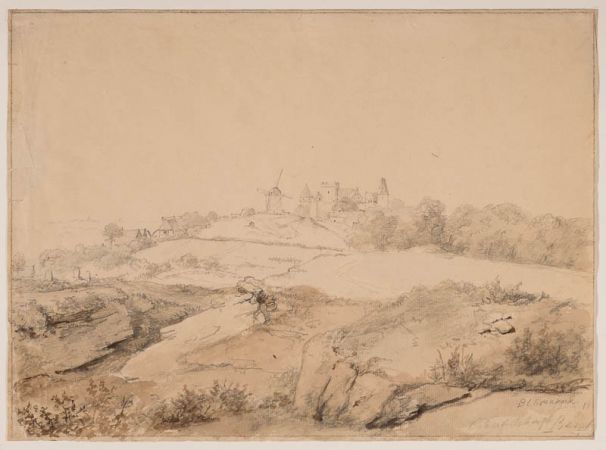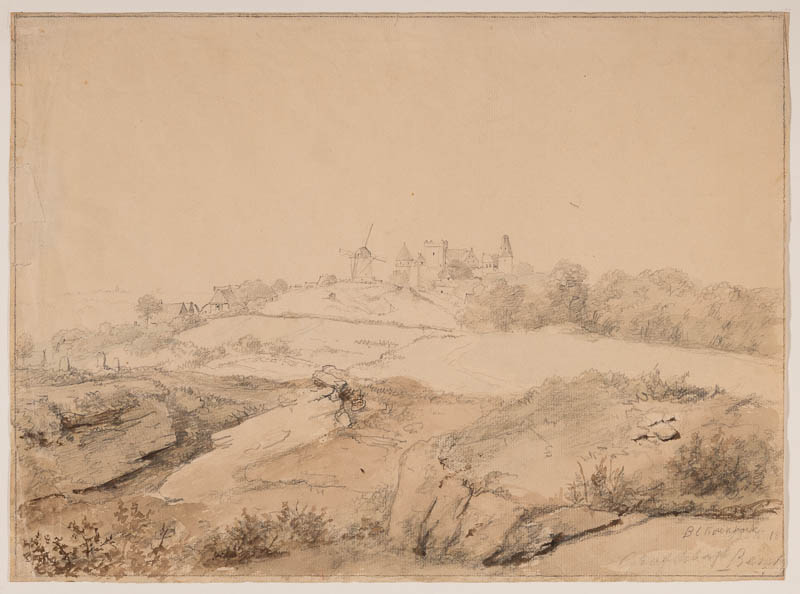 Blick auf Bentheim; Blick auf Höhenzug mit Mühle, Burg Bentheim und Dorf; links Ausblick in die Ferne. Bezeichnet: Grafschaft Bent.