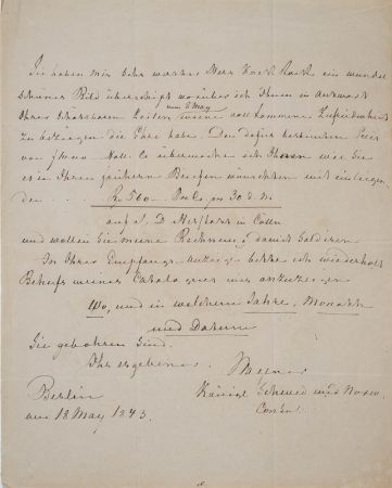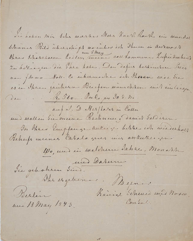 Brief des schwedisch norwegischen Konsuls in Berlin über ein erworbenes Gemälde von B.C. Koekkoek, unterschrieben am 18. Mai 1843.