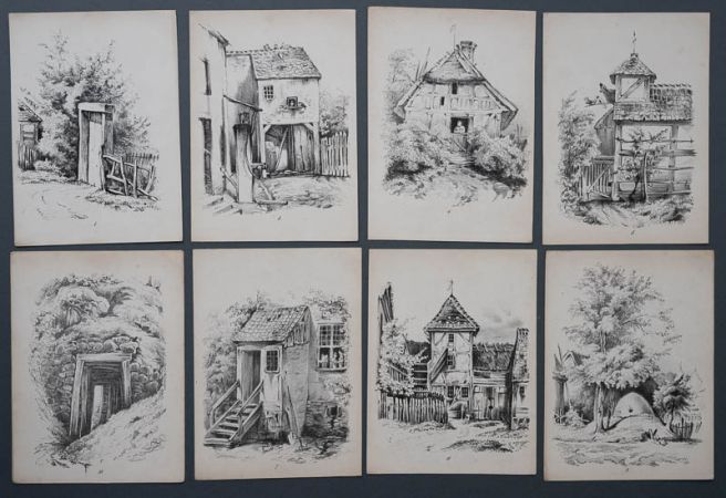 1. Systematische Teekenschool voor de Nederlandsche Jeugd - 1. Systematische Zeichenschule für die niederländische Jugend; Titel auf der Einschlagmappe; 16 Lithographien (durchnummeriert) mit landschaftlichen und architektonischen Details als Vorlage für den Zeichenunterricht; Lithografien nach B.C. Koekkoek und anderen.