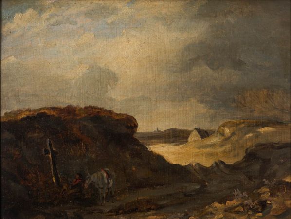 Landschaft mit Reiter, der vor einem Kreuz kniet.