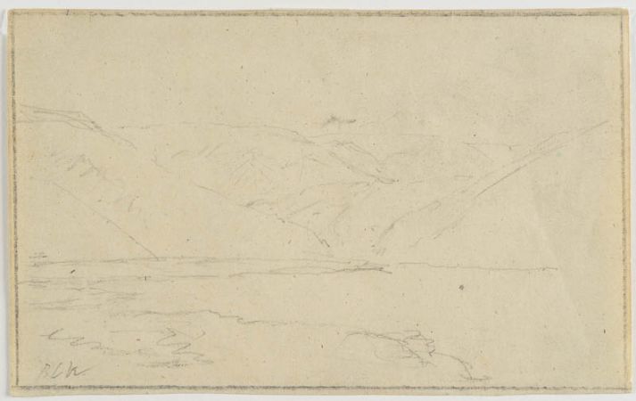 Skizzenbuchblatt: Gebirgslandschaft mit großem Tal.