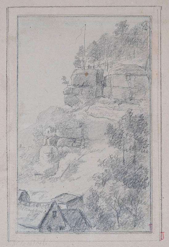 Blick auf Felskante mit Aussichtpunkt und kleine Bastei bei Bad Schandau an der Elbe; im Vordergrund Bäume und Häuser. Bezeichnet: Kleine Bastij bij Stad Schandou