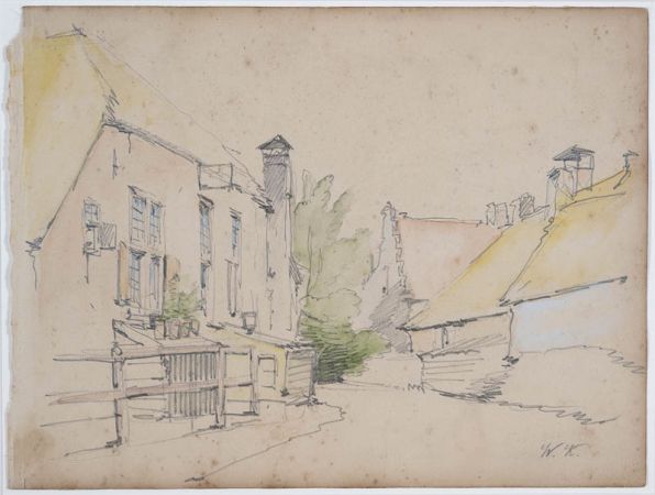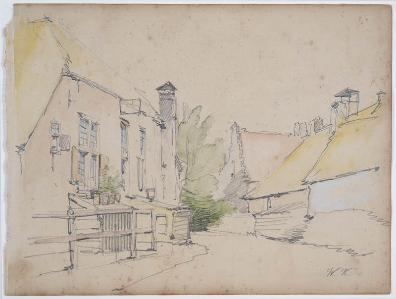 Zwei Dorfansichten; Vorderseite: aquarellierte Zeichnung einer Straße mit Häusern auf beiden Seiten; Rückseite: Skizze eines Hauses