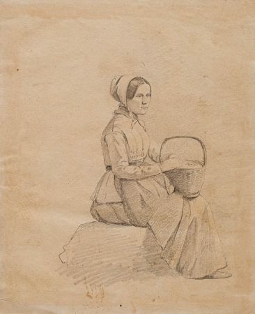 Figurenstudie einer sitzenden Frau, mit Korb auf ihrem Schoß, gekleidet in Haube und Unterkleid; Seitenansicht mit leicht dem Betrachter zugewandtem Kopf.