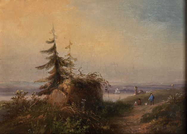 Blick ins Flusstal; auf einer Hügelkuppe liegt links ein großer Felsblock, auf dem einzelne Kiefern wachsen; rechts davon einige Personen, ein Kind und ein Hund; im Tal erkennt man einen Fluss, auf dem ein Segelboot fährt; auf der anderen Seite liegt am Abhang eine Burg.