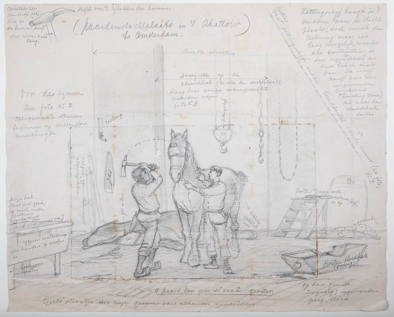 wahrscheinlich Vorstudie für eine Zeitungsillustration; verschiedene Beschreibungen auf Niederländisch für die Weiterbearbeitung zu einem Gemälde/Zeichnung. Bezeichnet: Paardenslachtplaats in 't Abattoir te Amsterdam