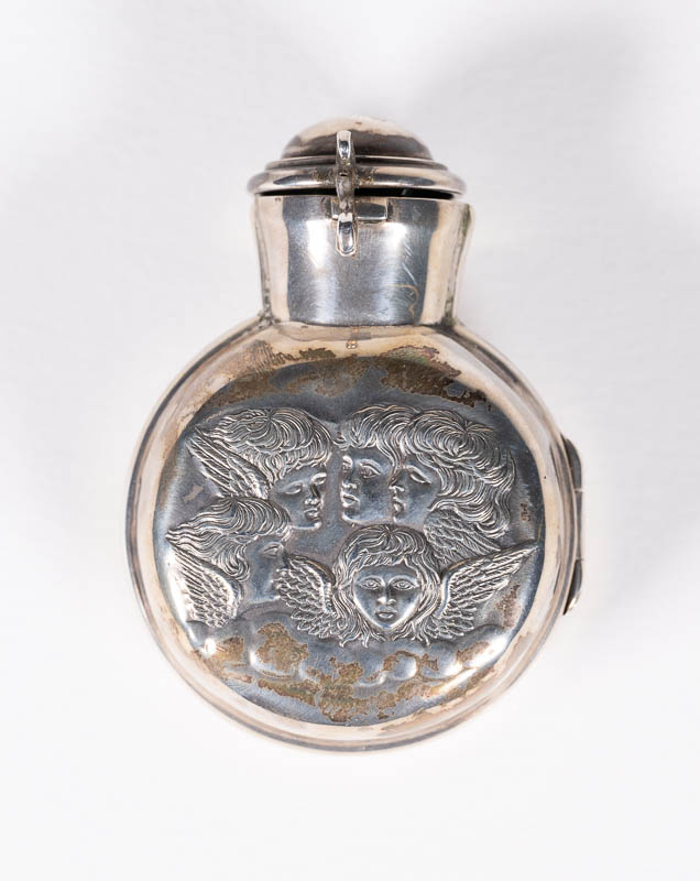 Grüngläserne Parfümflasche in flaschenförmigen silbernen Behälter aus zwei Hälften; Reliefdekor von Engelköpfen; die zwei Hälften sind klappbar, mit ebenfalls Scharnierdeckel.