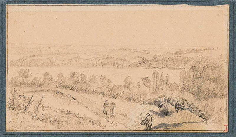 Blick auf eine hügelige Landschaft (Limburg) mit drei Personen im Vordergrund
