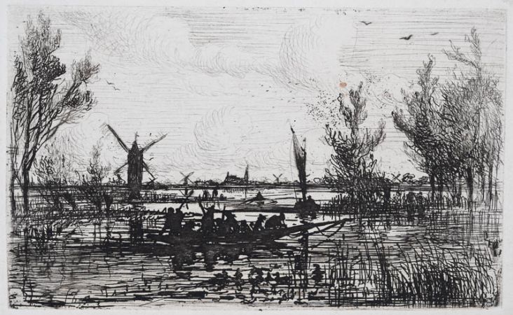 Ein Boot im Vordergrund mit mehreren Personen darin, fährt übers Wasser; am Horizont eine holländische Landschaft mit Mühle und Wasserlandschaft; wie 0578 .